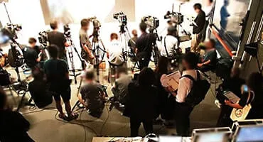 2017年7月18日、映画のPRイベントに浜町Bスタジオをご利用いただきました。 会場には映画をイメージしたバックパネルをセッティングし、舞台裏は演者さんの出演導線を確保するため、美術バトンから暗幕を吊るして臨時通路を設けました。また、会場内でのスピーカーの音響や、カメラへ直接ライン出力をつなぐプレス向け音声の音響オペレーター、実際に場内で流すVTRの叩き(再生)や、出演者へ撮影している映像を確認してもらうためのスイッチング(映像切り替え)を行う映像オペレーターとして、当スタジオスタッフも参加いたしました。
