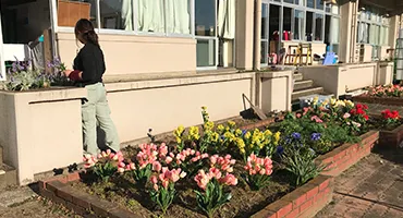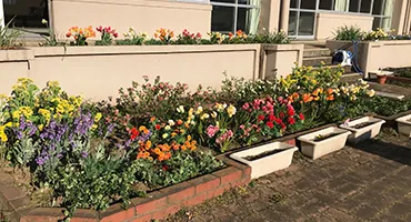 造花を使い色とりどりの花が咲き誇る花壇も再現。